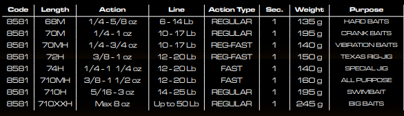 Modelo exclusivo de agua dulce destinado a la pesca del bass. Cada modelo está desarrollado para cubrir técnicas muy específicas, las cuales aparecen determinadas e indicadas en el propio blank de la caña (Texas rig, top water, swim bait….).